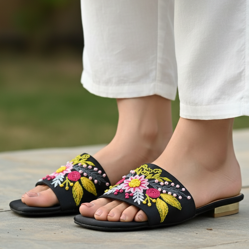These Grace Up Flats 644 feature beautifully crafted multi-colored embroidery, adding a touch of elegance to any outfit. The unique design showcases the brand's attention to detail and expert craftsmanship. Elevate your style with these flats, perfect for any occasion.