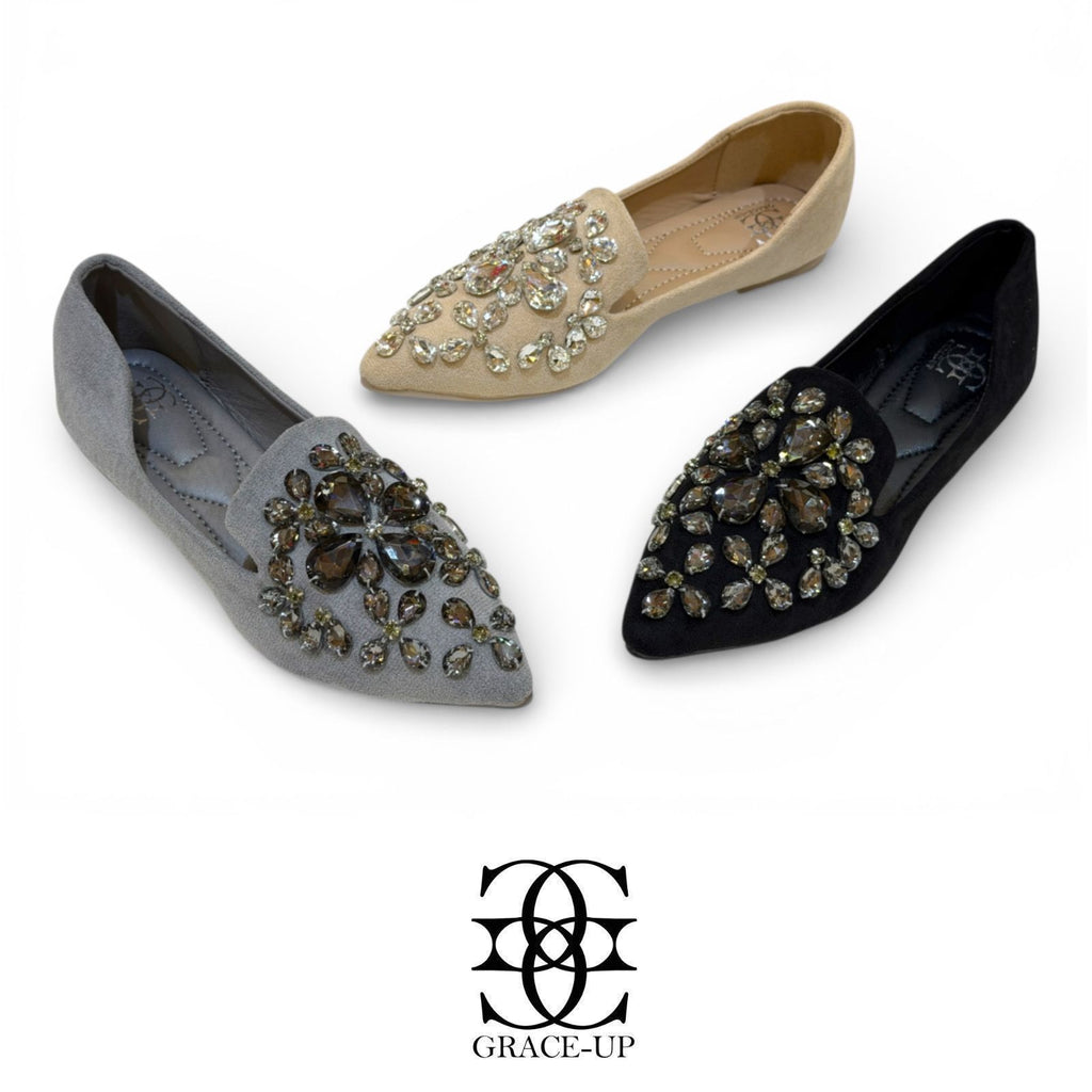 Introducing the Grace Up Flats Pump 516, featuring elegant pumps adorned with sparkling stones. Elevate your style and add a touch of glamour with these chic and versatile shoes. Perfect for any occasion and designed to make you stand out in a crowd.