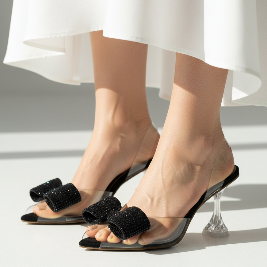 Introducing the Grace Up Heels 0405, featuring a stunning transparent heel adorned with a sparkling rhinestone bow. This unique design adds an touch of elegance to any outfit, making you stand out with every step. Elevate your style with these eye-catching heels.