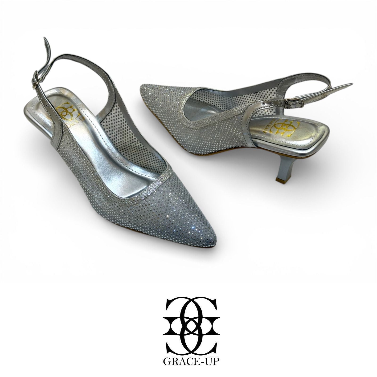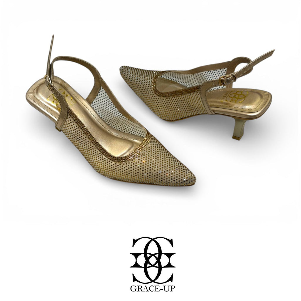 Elevate your style with the Grace Up Heels 0478. These net heels feature a slingback design and are adorned with shimmering rhinestones, perfect for adding a touch of glamour to any outfit. The sturdy heel provides stability while the net material adds a touch of elegance.