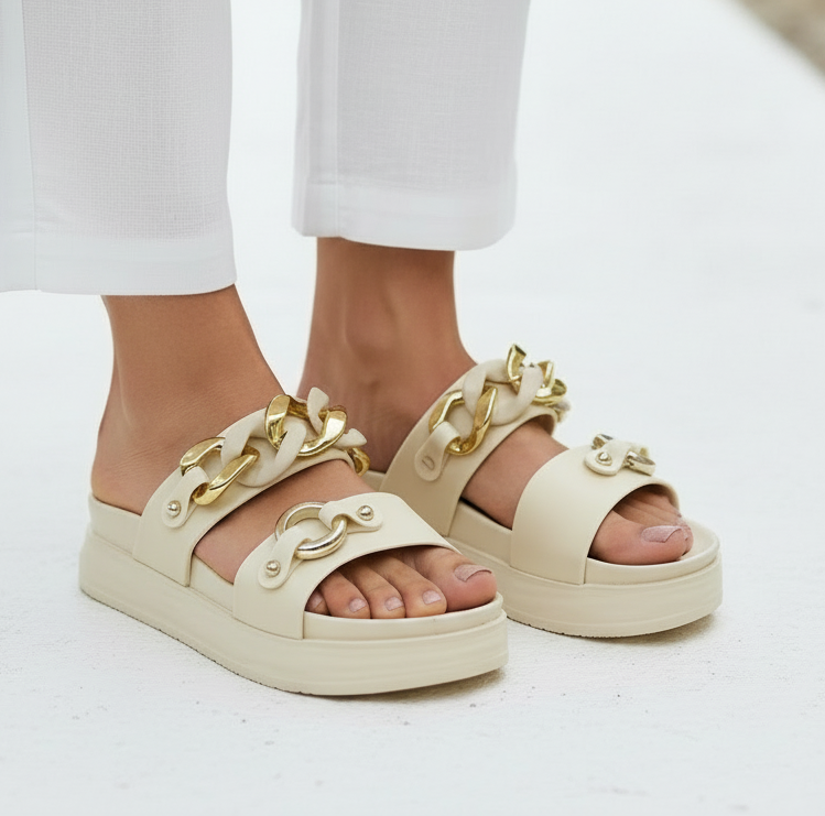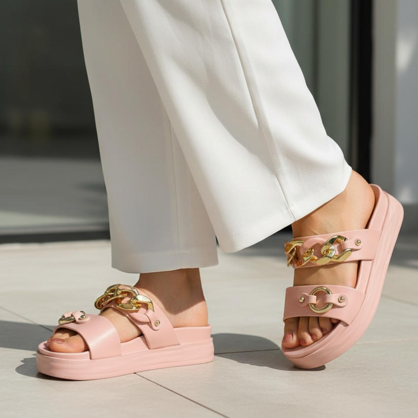 Introducing Grace Up Softie S28, the perfect combination of comfort and style. With a thick rubber sole and a chic chain detail, these slides offer both support and a trendy look. Walk with confidence and effortlessly elevate any outfit. Upgrade to a new level of comfort and style with Grace Up Softie S28.