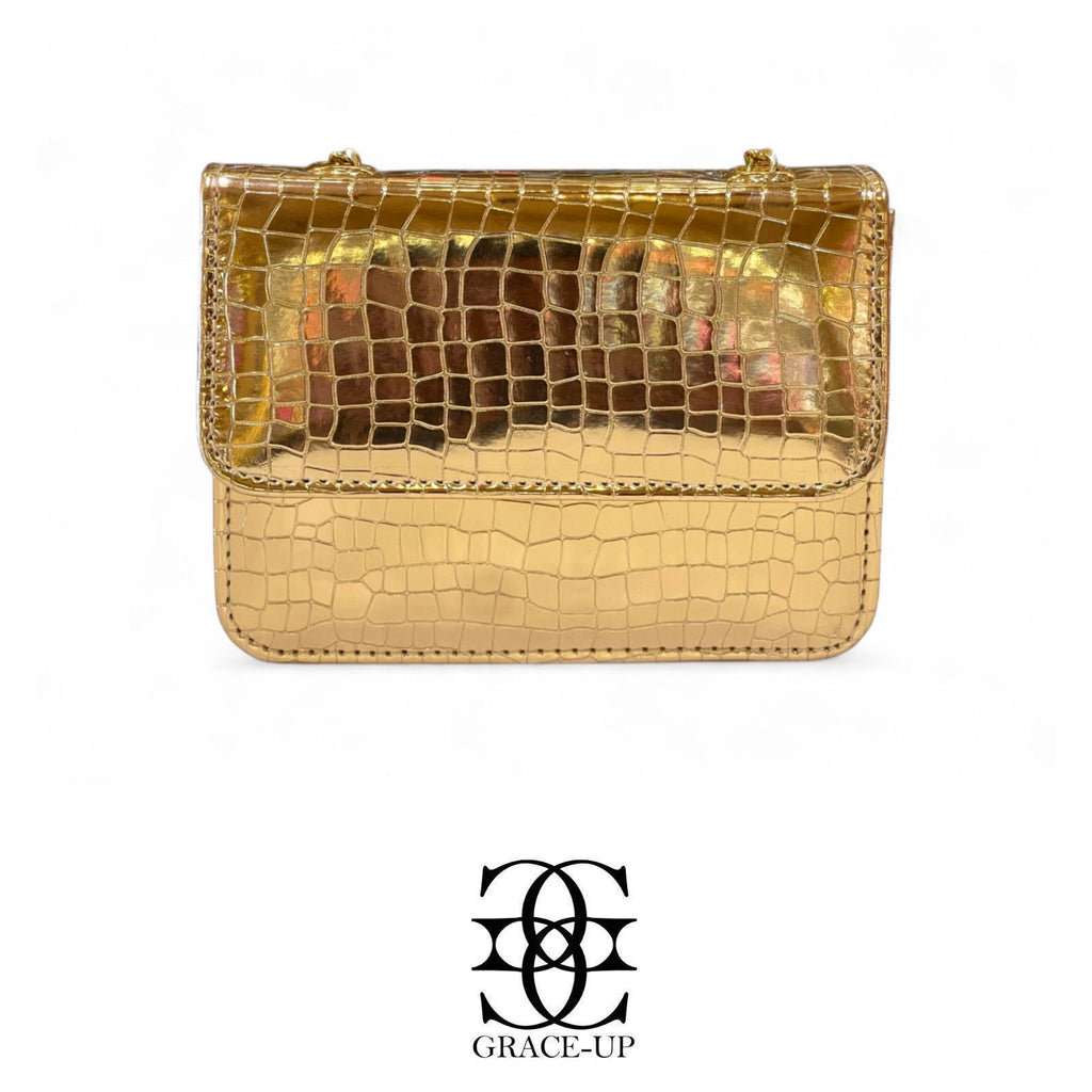 A perfect bag for party wear! Featured rose golden chrome textured synthetic leather. Contains complementary chain for hassle free use.