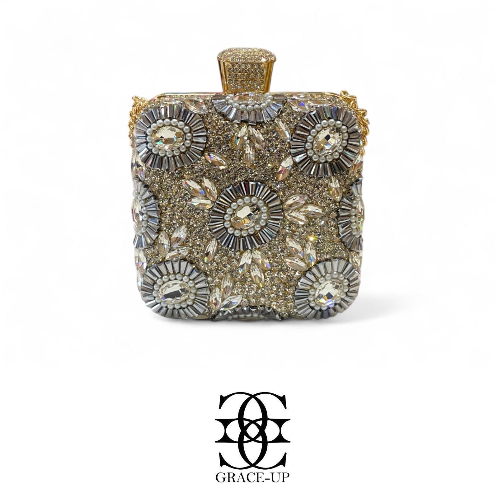 A perfect clutch for Brides! Featured silver with silver big stones single side & stones nob metal case. Contains hanging chainfor hassle free wear!