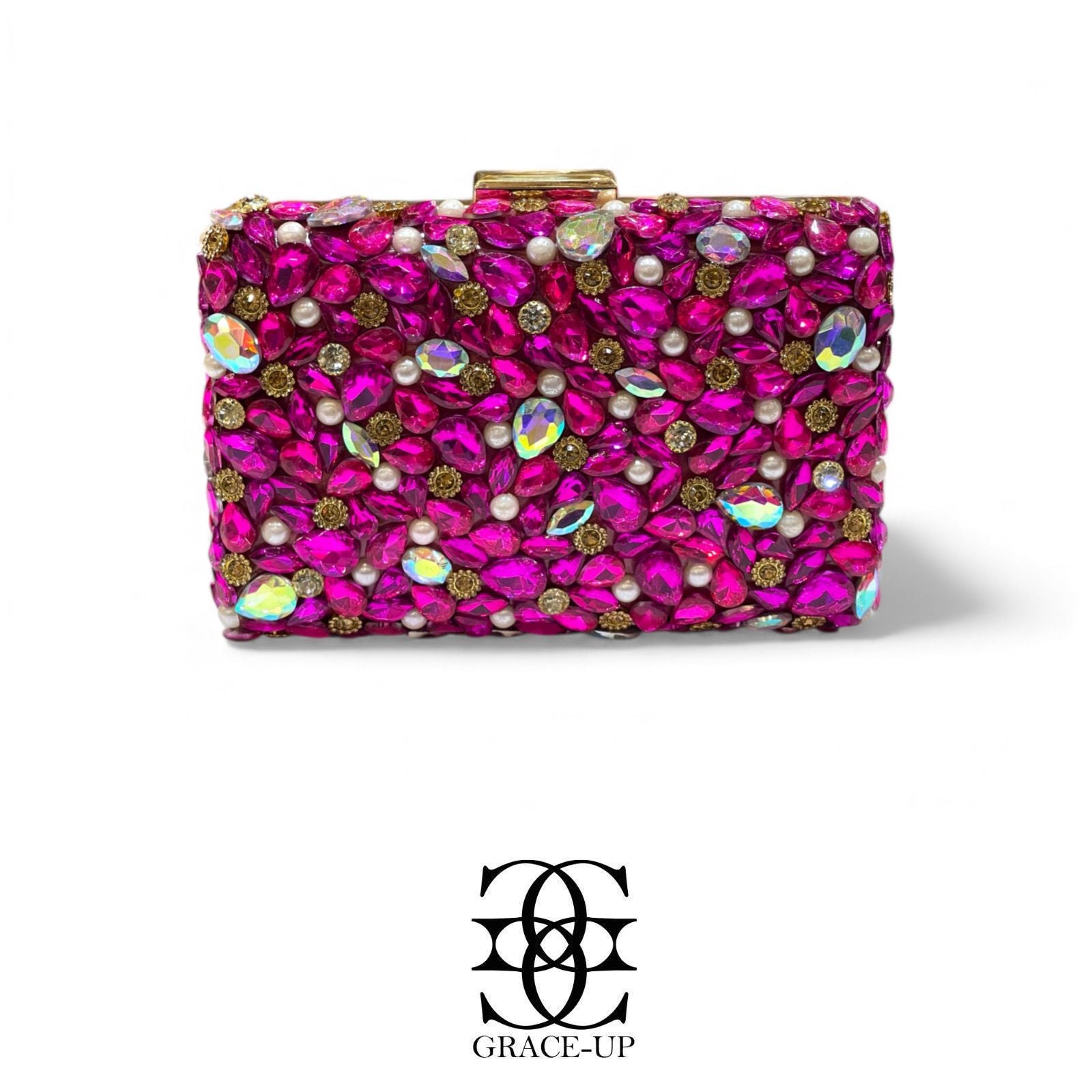 A perfect clutch for Brides! Featured shocking pink big stones single side & metal case. Contains complementary bangle for hassle free wear!