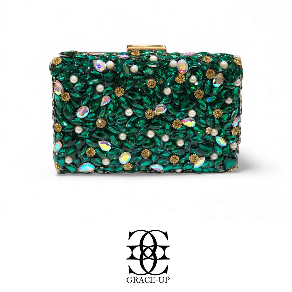 A perfect clutch for Brides! Featured green big stones single side & metal case. Contains complementary bangle for hassle free wear!