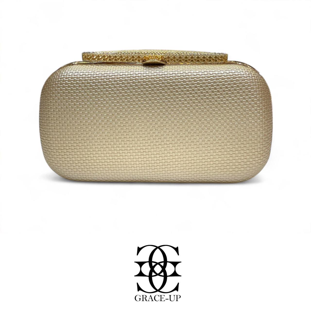 A perfect clutch for brides! Featured gold textured synthetic leather & long metal nob. Contains complimentary chain for hassle free wear.