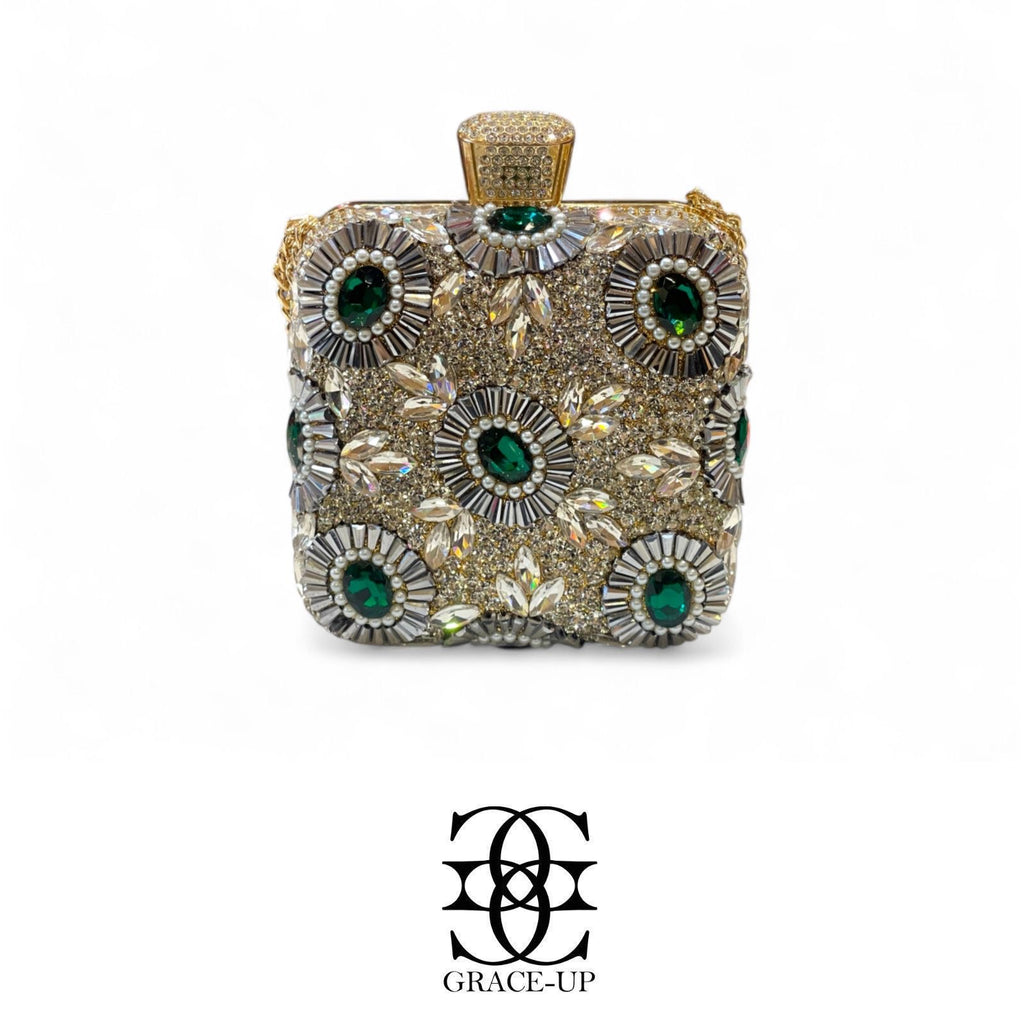 A perfect clutch for Brides! Featured silver with Green/silver big stones single side & stones nob metal case. Contains hanging chainfor hassle free wear!