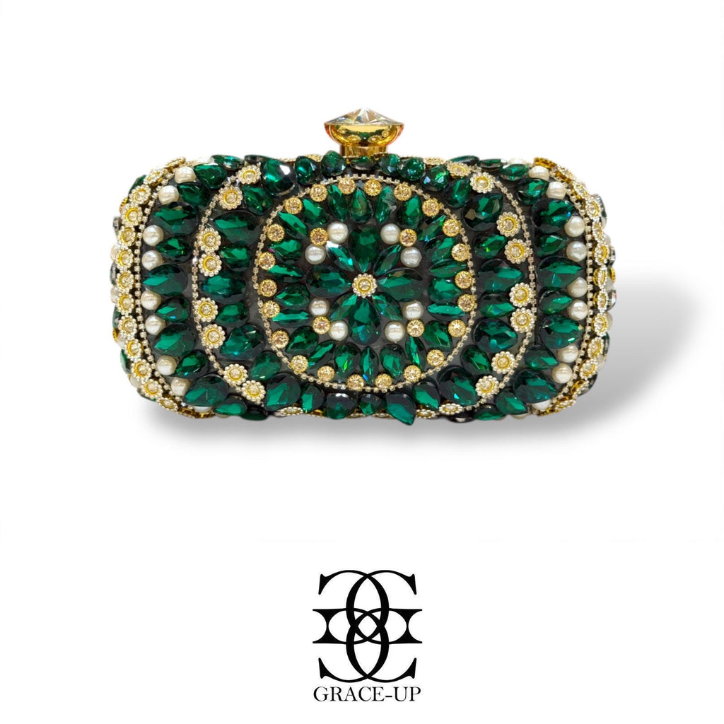 A perfect clutch for Brides! Featured green with big stones work (single side) & stone nob metal case.Contains complementary bangle for hassle free wear!