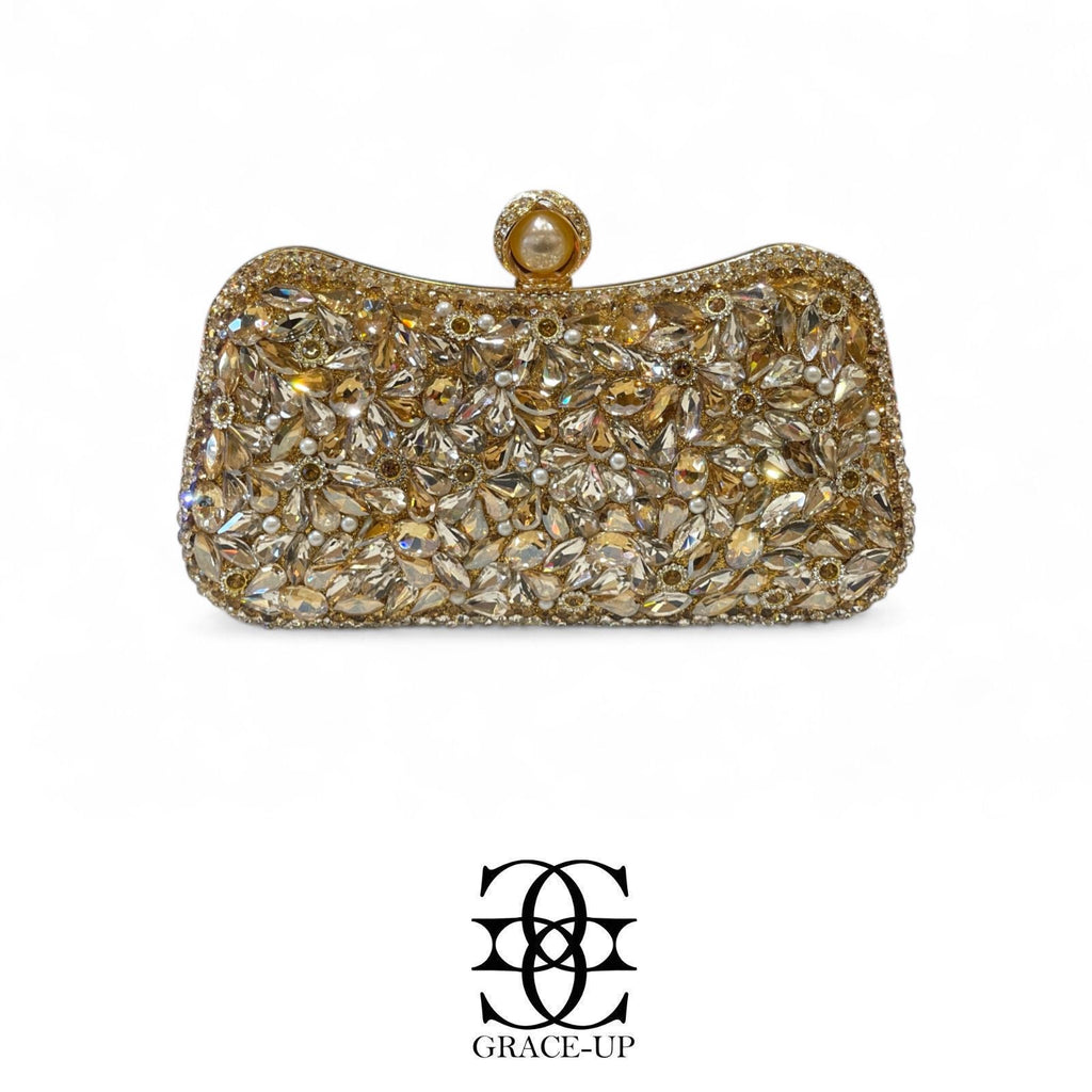 A perfect clutch for Brides! Featured golden with golden big stones single side & pearl nob metal case. Contains complimentary bangle for hassle free wear