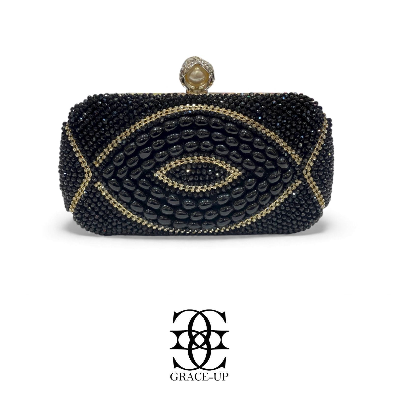 A perfect clutch for Brides! Featured black beads  embroidery (singles side)& pearl metal nob. Contains complimentary bangle for hassle free wear.