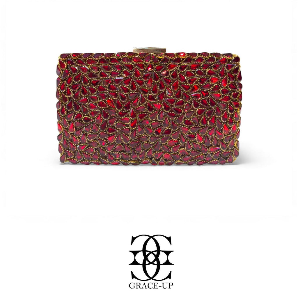 A perfect clutch for brides ! Featured maroon shell shaped stones single side & metal case. Contains complimentary bangle for hassle free wear!