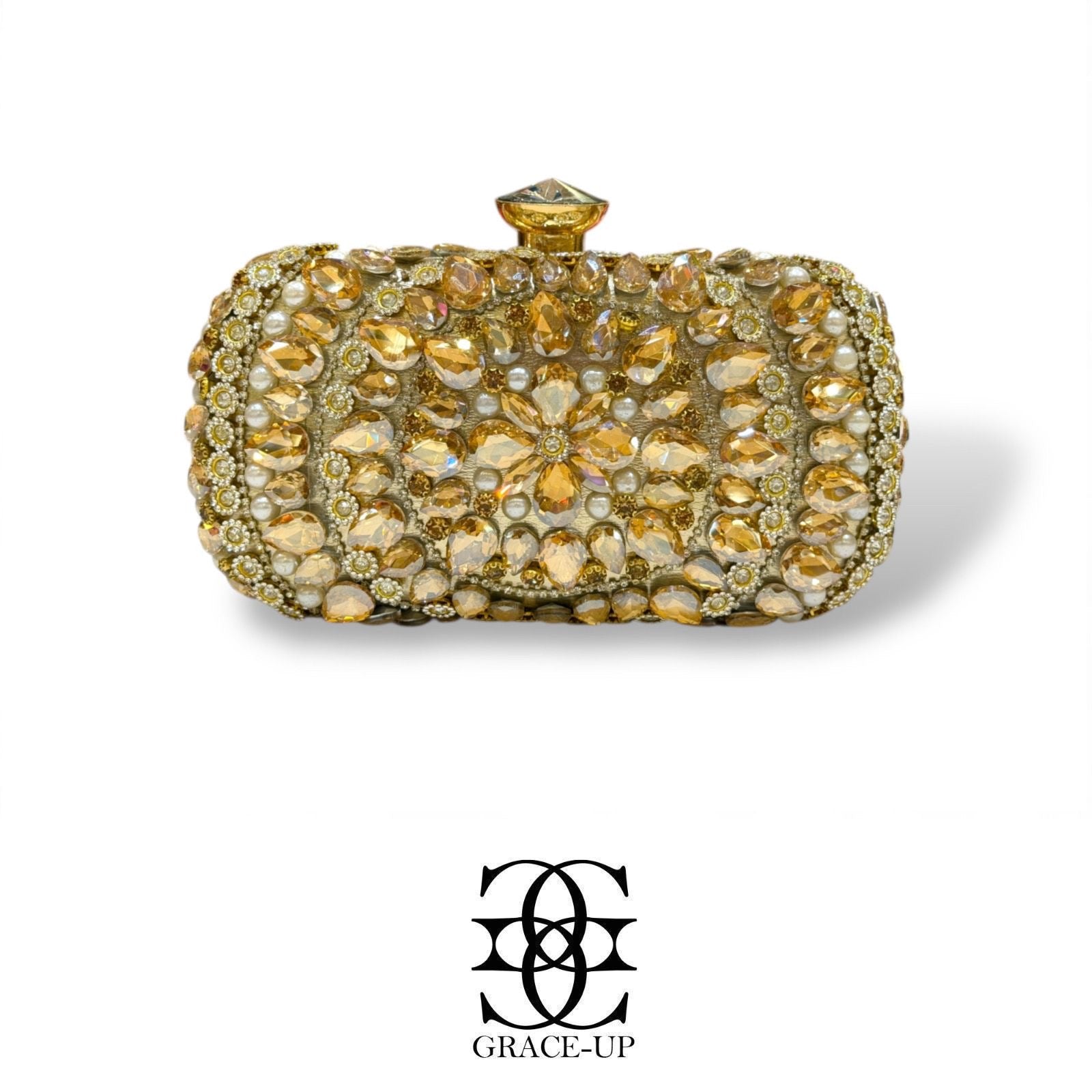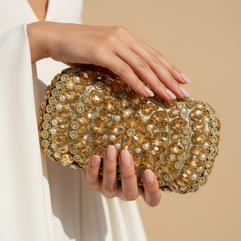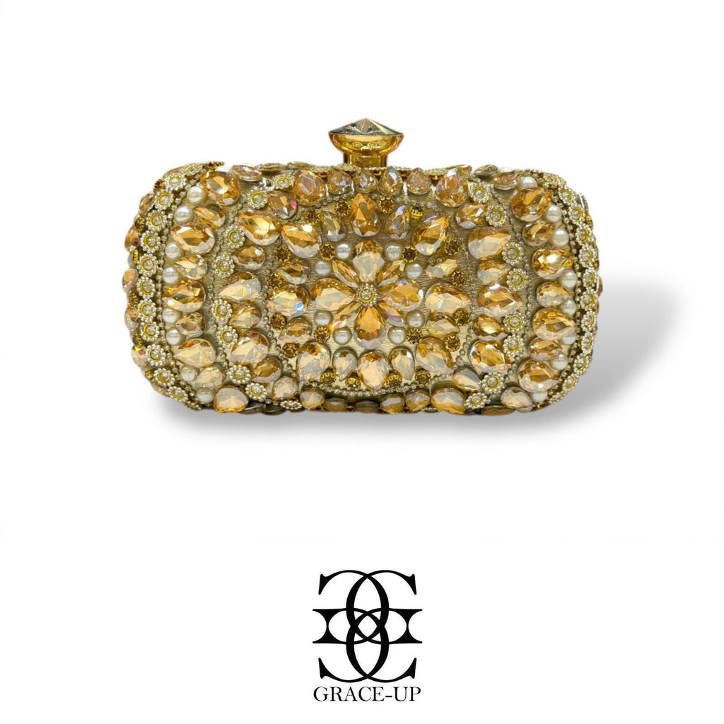 A perfect clutch for Brides! Featured Golden with big stones work (single side) & stone nob metal case.Contains complementary bangle for hassle free wear!
