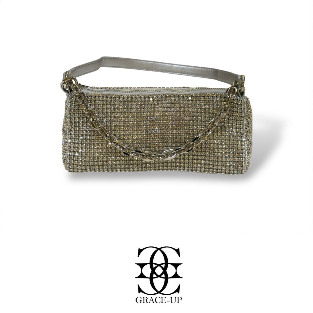 A perfect premium clutch for Brides! Featured silver big rhinestones double sided with hanging chain & stylish handle . Contains complimentary chain for hassle free wear.