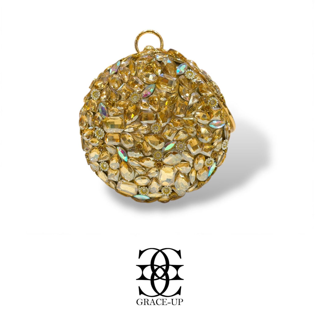 Perfect round shape clutch for Brides! Featured with full gold big stones work single side & round metal frame with hanging bangle.