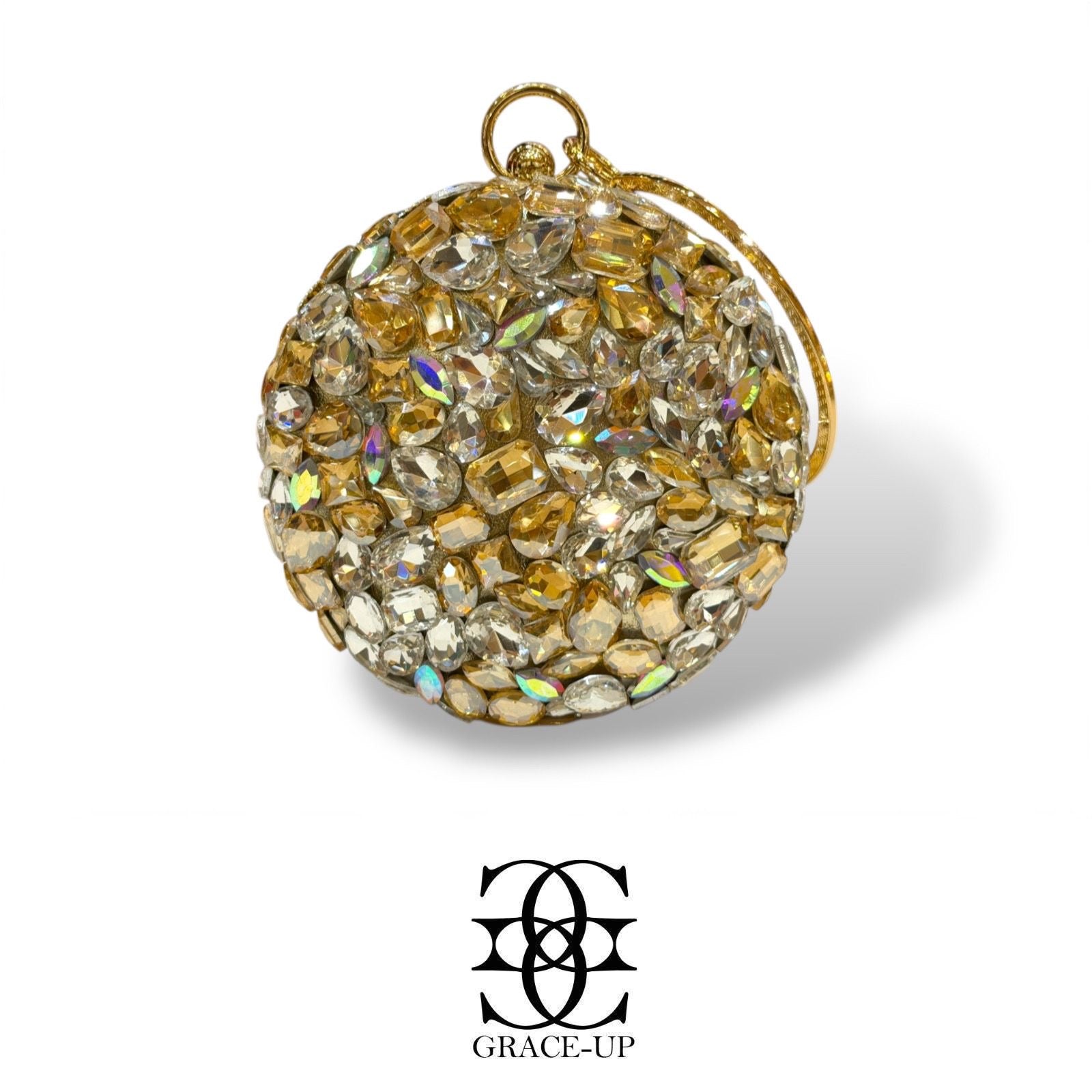 Perfect round shape clutch for Brides! Featured with full gold/silver big stones work single side & round metal frame with hanging bangle.