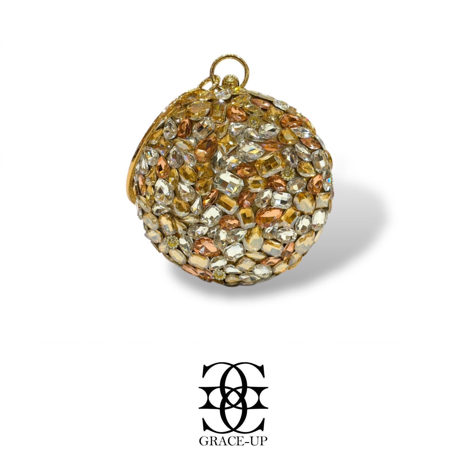 Perfect round shape clutch for Brides! Featured with peach/silver big stones work single side & round metal frame with hanging bangle.