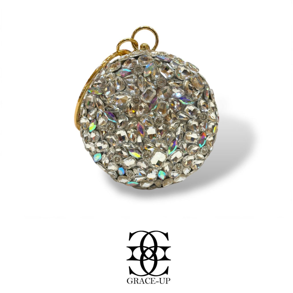 Perfect round shape clutch for Brides! Featured with full silver big stones work single side & round metal frame with hanging bangle.