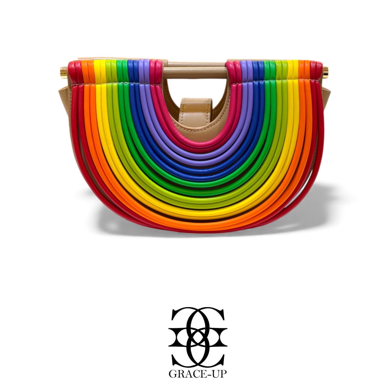A perfect bag for party wear! Featured rainbow colored D shaped bag with soft synthetic leather strips single side .contains complementary belt for hassle free wear!