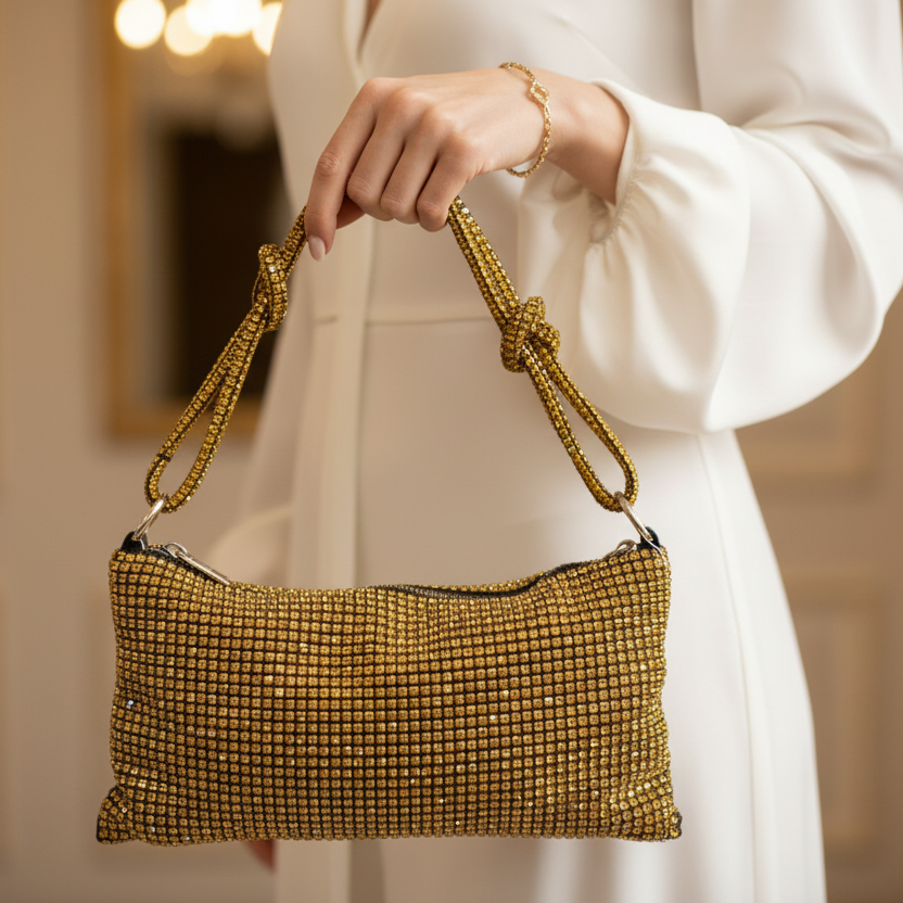 A perfect bag for bridal wear! Featured full gold double sided big stones & full stones with doublr knot handle.contains complementary chain for hassle free wear!