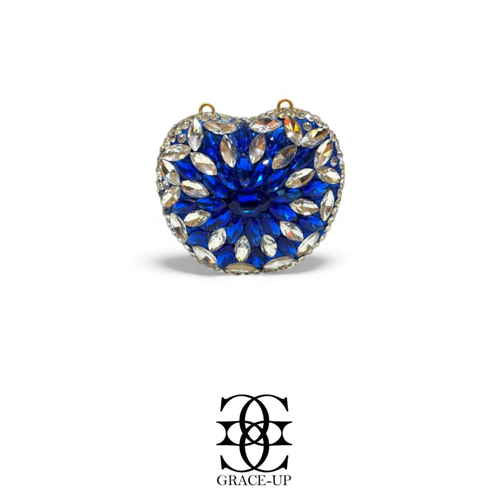 A perfect clutch for party wear ! Featured full blue/silver covered with stones double sided & apple shaped metal case. Contains complimentary chain for hassle free wear!