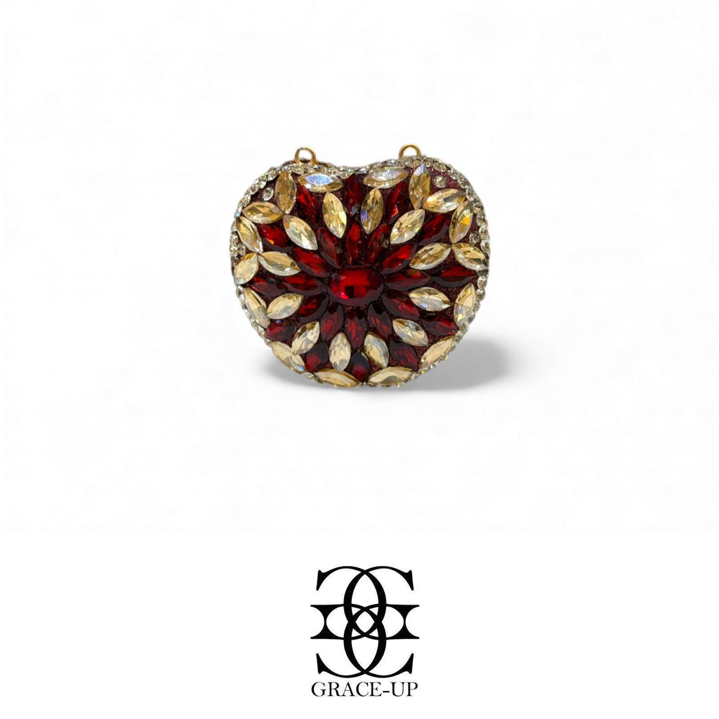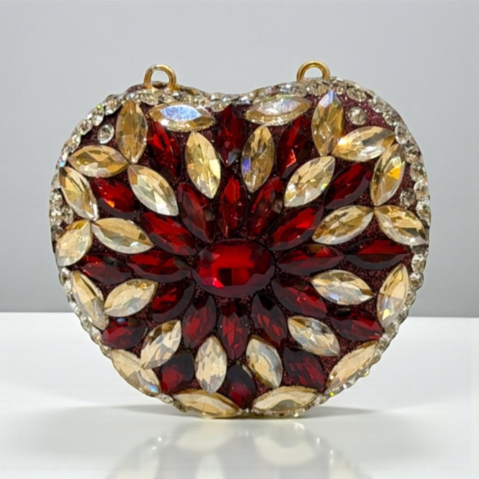 A perfect clutch for party wear ! Featured full maroon/silver covered with stones double sided & apple shaped metal case. Contains complimentary chain for hassle free wear!