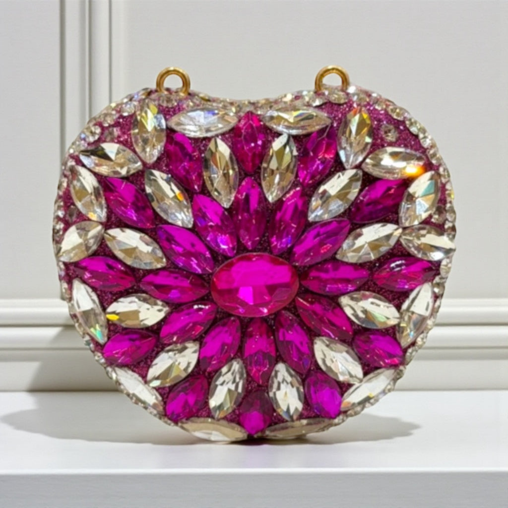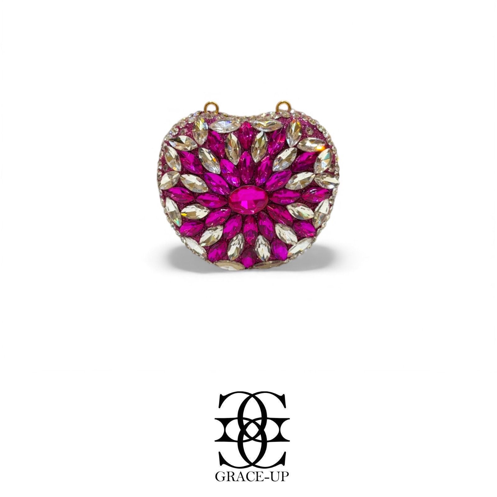 A perfect clutch for party wear ! Featured full maroon/silver covered with stones double sided & apple shaped metal case. Contains complimentary chain for hassle free wear!