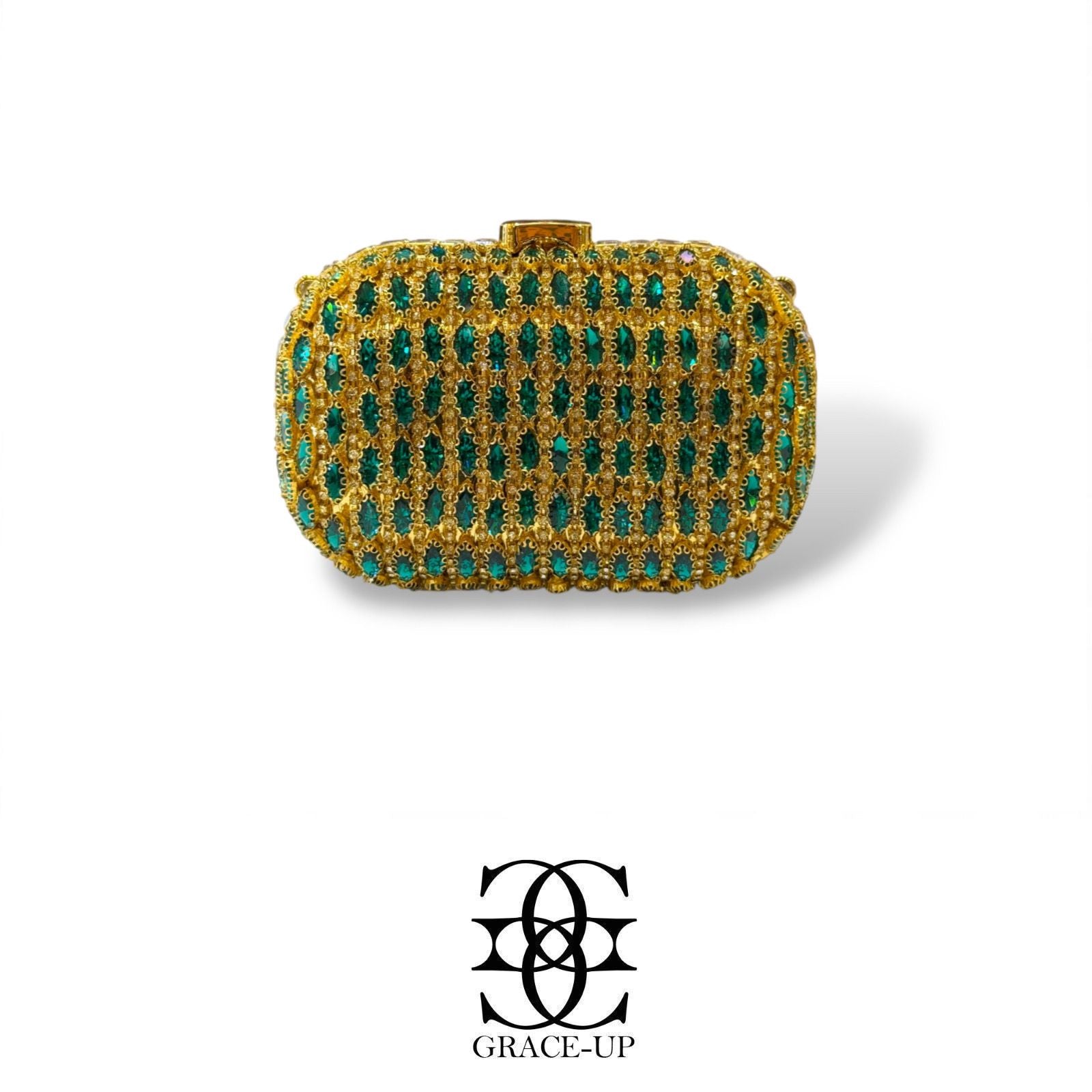 A perfect clutch for party wear ! Featured green stones work double sided with golden base . Contains complimentary chain for hassle free wear!