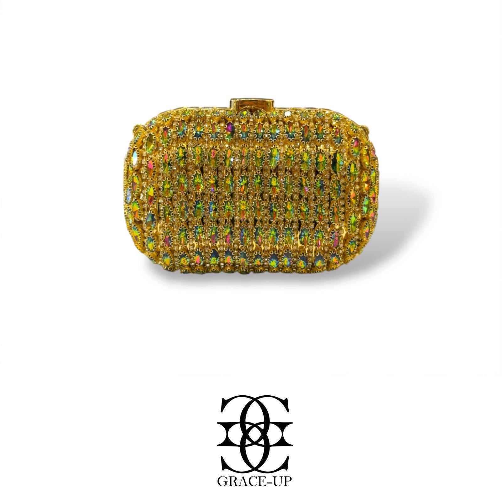 A perfect clutch for party wear ! Featured multi shaded stones work double sided with golden base . Contains complimentary chain for hassle free wear!