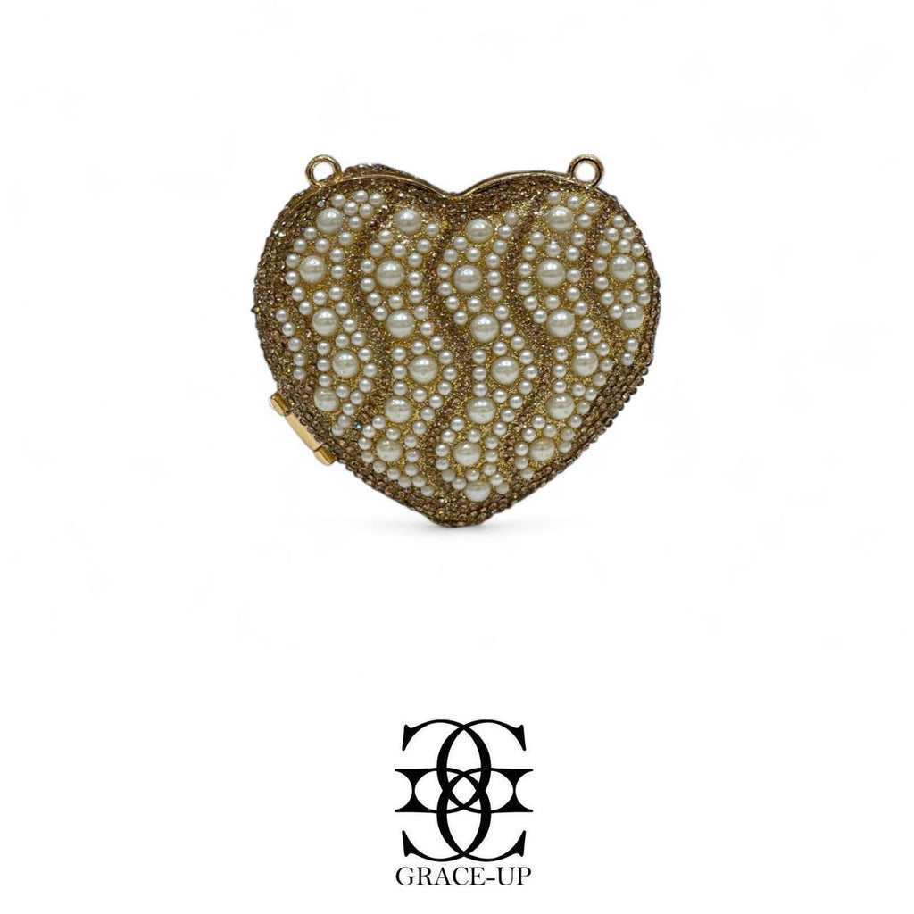 A perfect clutch for party wear ! Featured golden stones with pearls double sided & heart shaped metal case. Contains complimentary chain for hassle free wear!