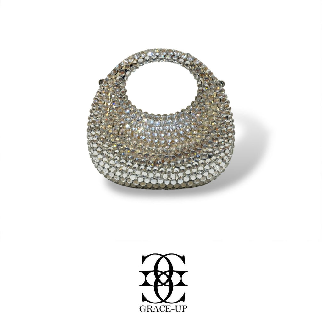 A perfect bag for bridal wear! Featured fully covered with silver sparkling rhinestones .contains complementary chain for hassle free wear!