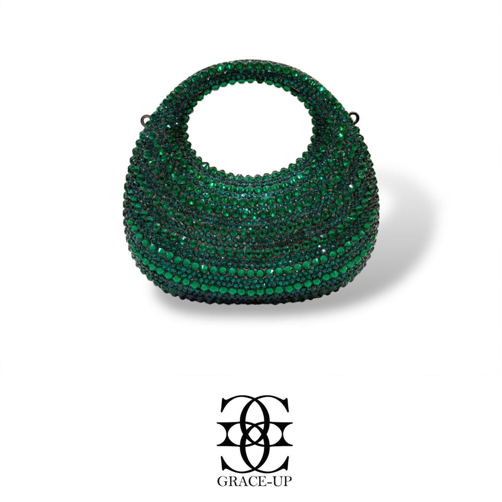 A perfect bag for bridal wear! Featured fully covered with green sparkling rhinestones .contains complementary chain for hassle free wear!