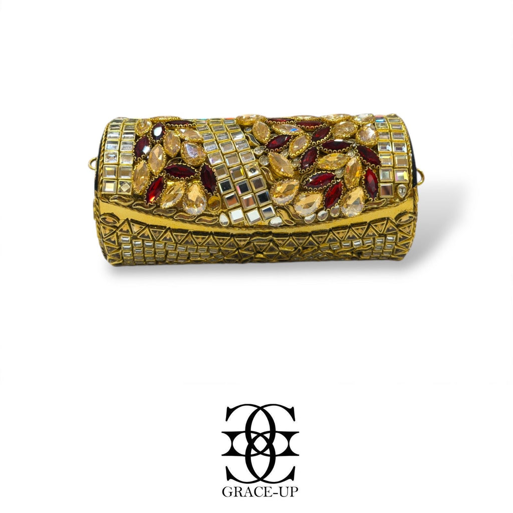 A perfect clutch for party wear ! Featured maroon/silver & golden kundan stones work double sided with roll shaped metal case. Contains complimentary chain for hassle free wear!