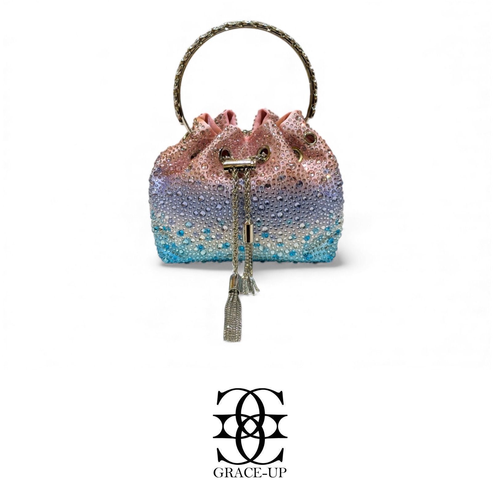 A perfect bag for Brides! Featured ferozi,lilac & peach full rhinestones covered with stylish stones bangle & stones tassel. Contains complimentary chain for hassle free wear!
