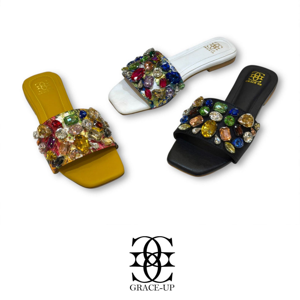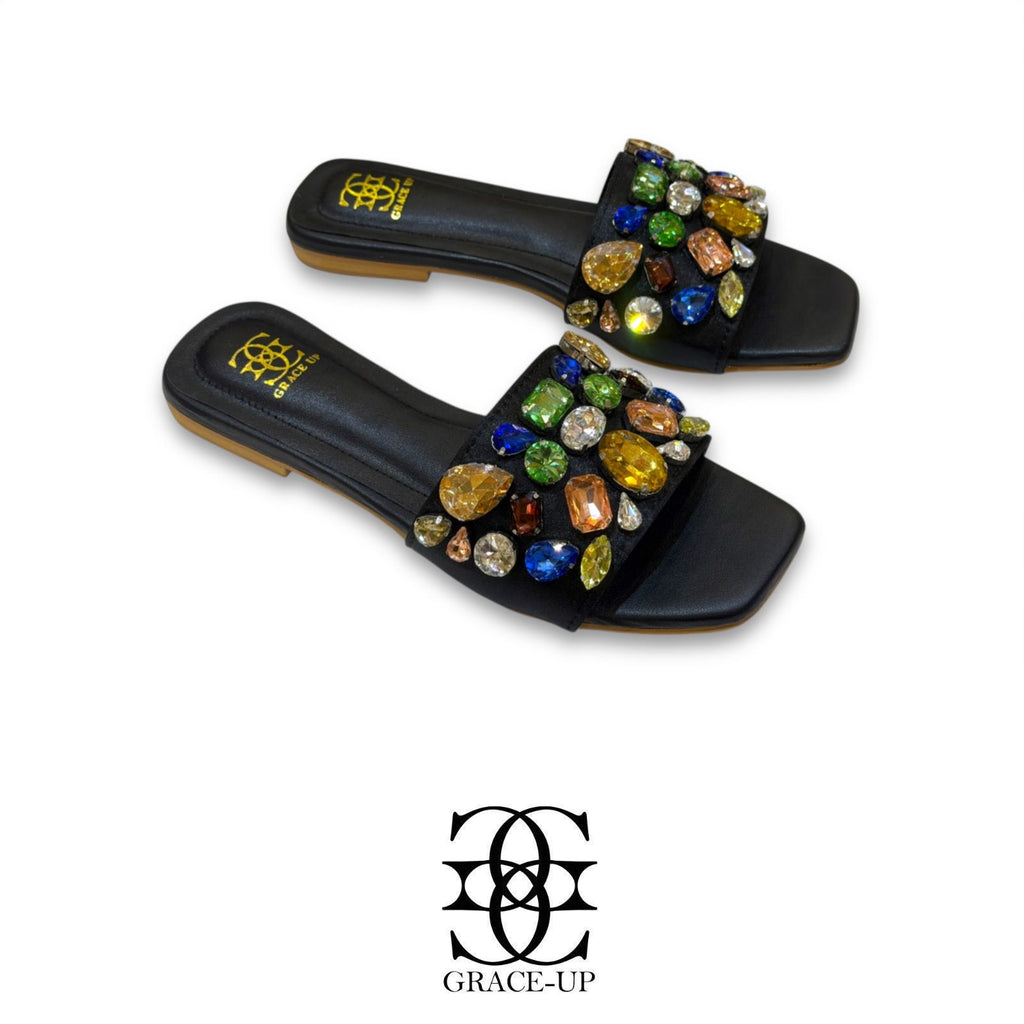Expertly crafted with a printed strap and multicolored stones, the Grace Up Flats 0783 provide both style and comfort. The extra cushion padded sole ensures all-day wearability. Elevate any outfit with these must-have slides.Colors