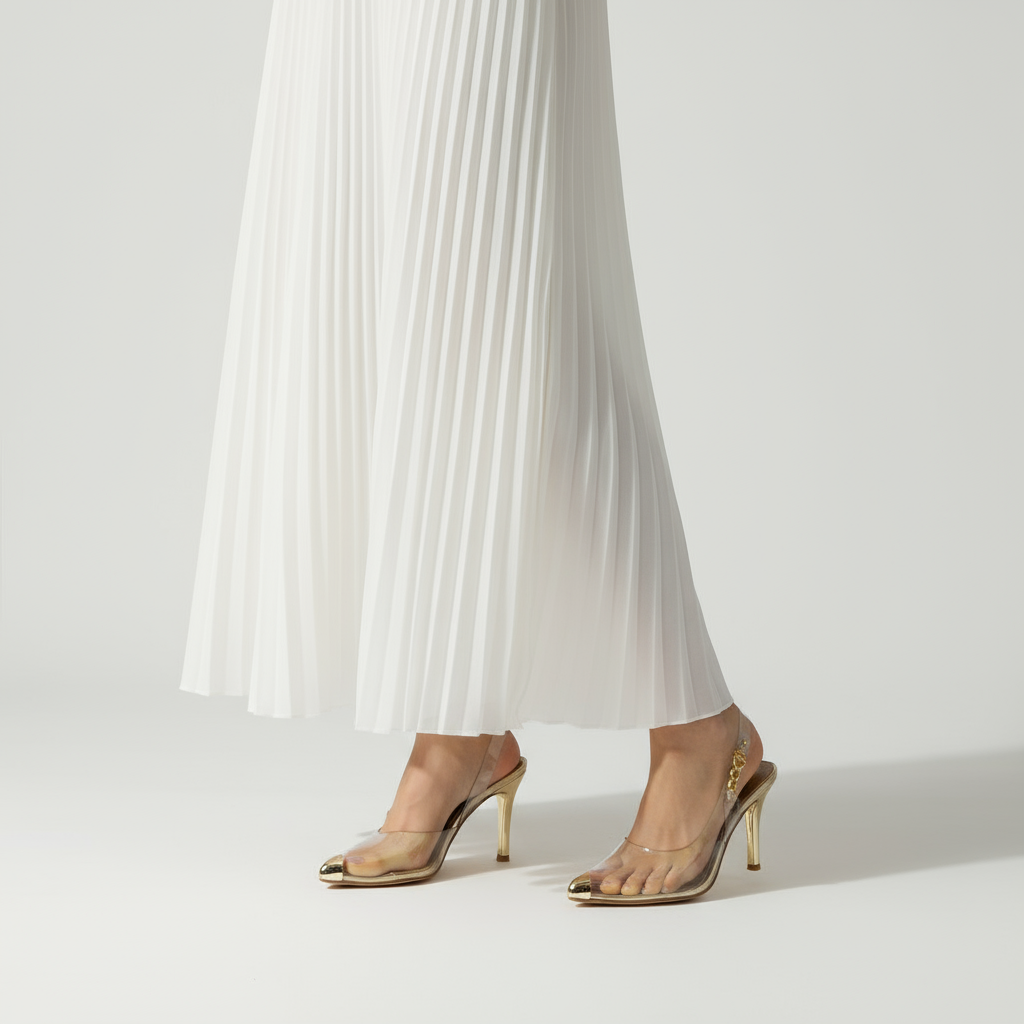 Elevate your style with Grace Up Heels 0467. These stylish transparent shoes feature a metal toe and side chain for a modern and edgy look. Experience added durability and a touch of luxury with these unique heels. Perfect for any fashion-forward individual who wants to make a statement.