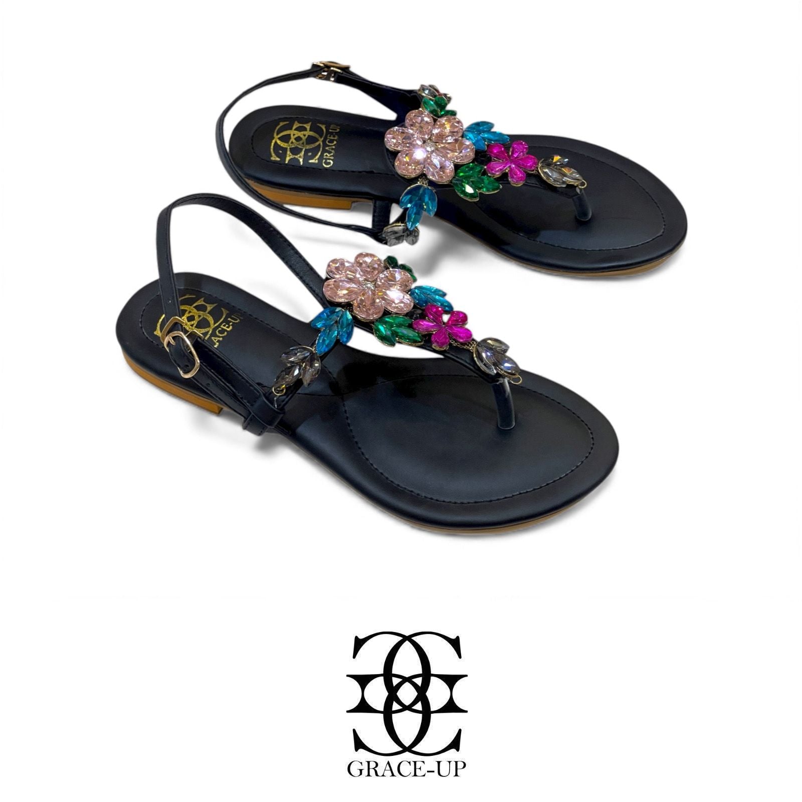 Elevate your summer style with Grace Up Flats 0617. These sandals feature a chic multicolored stone buckle, adding a touch of glam to any outfit. Stay comfortable and on-trend with the perfect combination of fashion and function.Colors