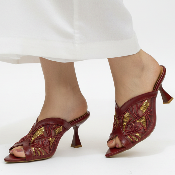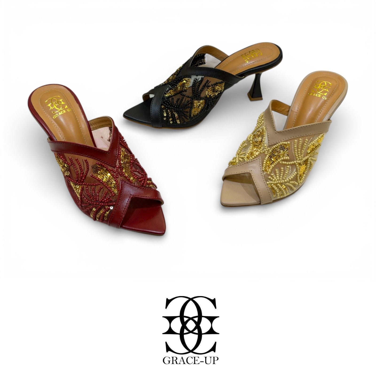 The Grace Up Heels 0890 feature net heels intricately designed with embroidery, combining aesthetic appeal with structural integrity. This design enhances breathability while providing a supportive framework. The unique combination of materials may improve comfort during prolonged wear, making these heels suitable for various occasions.