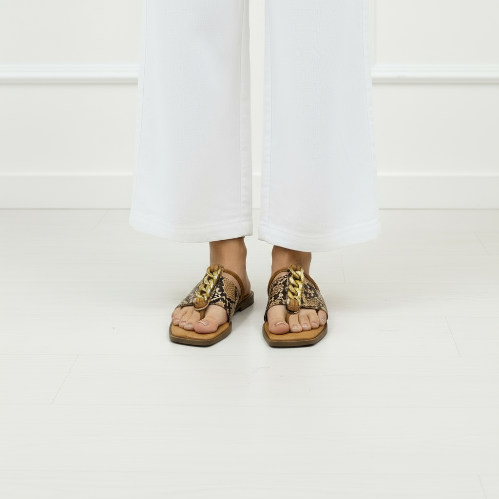 These Grace Up Flats 0601 are not only stylish, but also provide extra comfort with its cushion padded sole. The casual slides feature a big chain and snake print, bringing an edgy touch to your look. Say goodbye to sore feet and hello to fashion-forward comfort.
