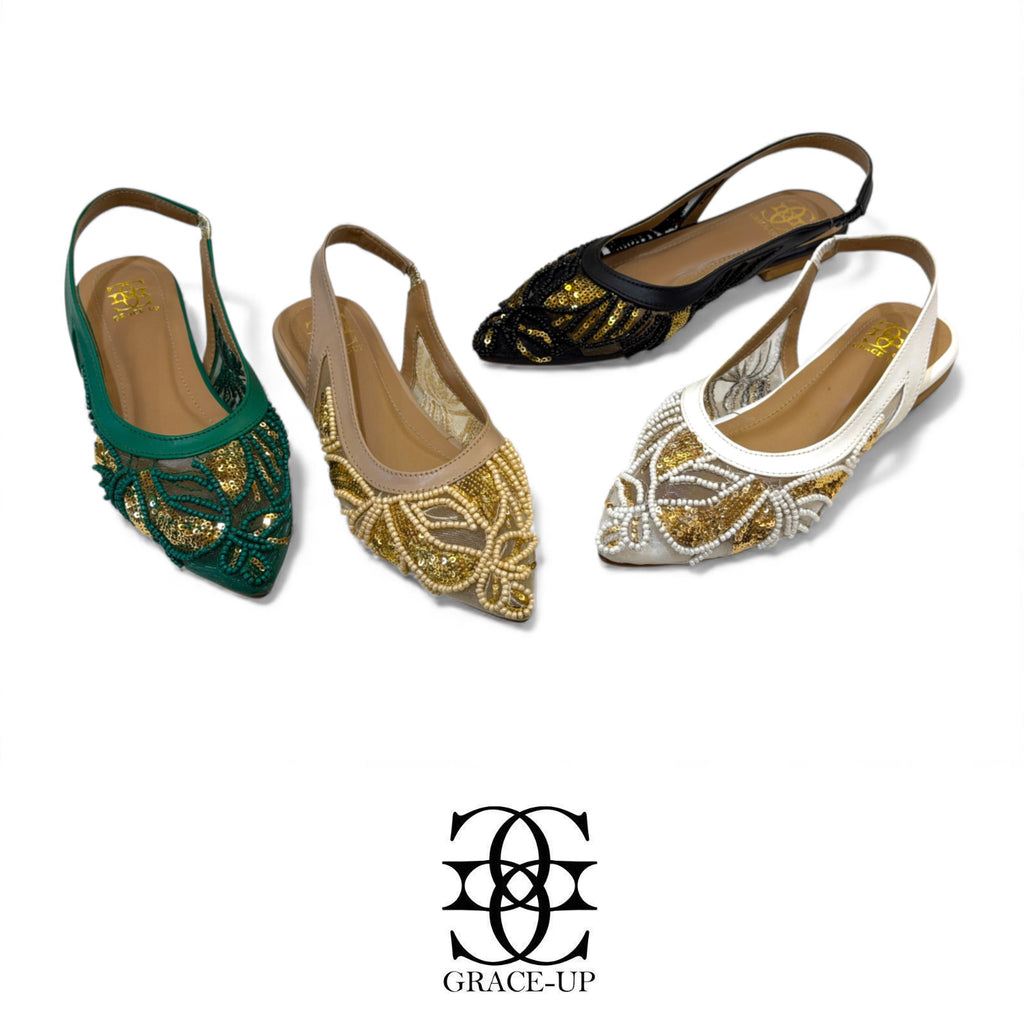 These Grace Up Flats 0612 feature a delicate net slingback design embellished with intricate embroidery. Elevate your outfit with these elegant and stylish flats. Perfect for any occasion, these flats offer a touch of sophistication and comfort.