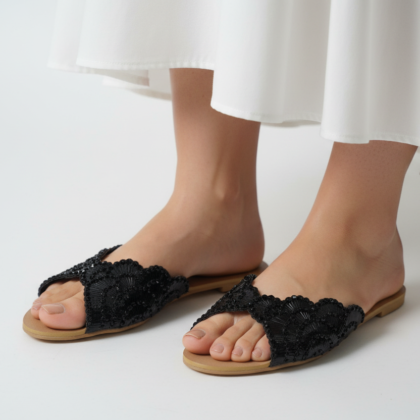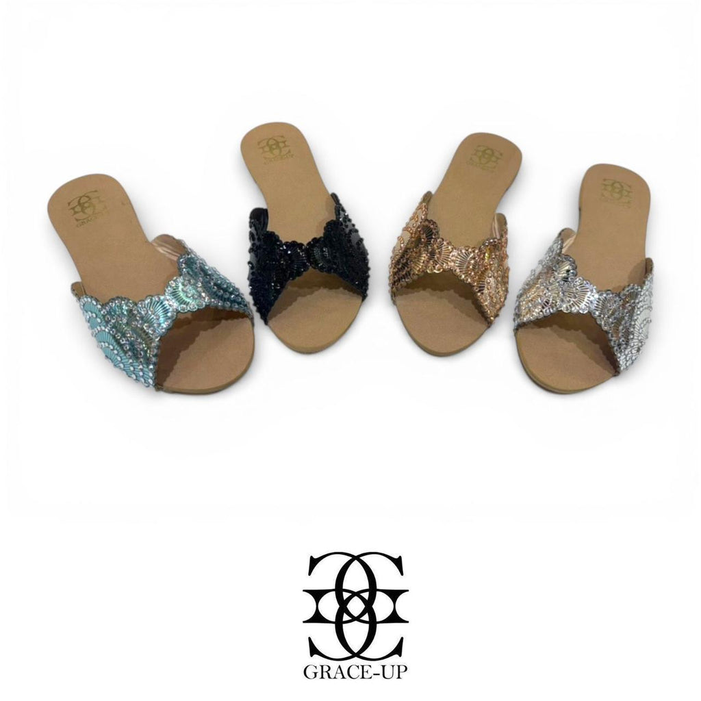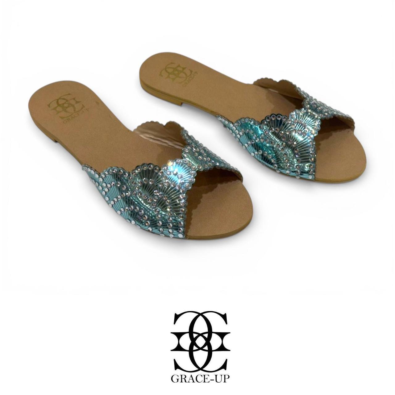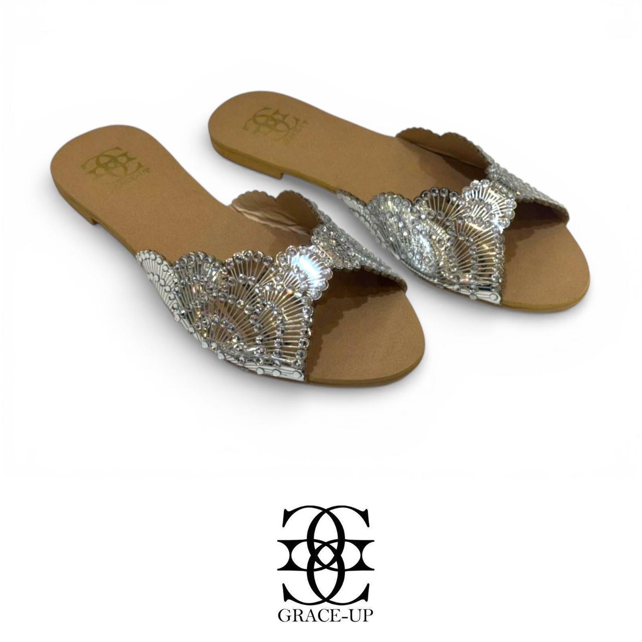 The Grace Up Flats 0793 feature a distinctive flower pellet design adorned with rhinestones. This combination enhances aesthetic appeal while providing a stable and comfortable fit, making them suitable for prolonged wear. The design adds a touch of elegance, suitable for both casual and formal occasions.
