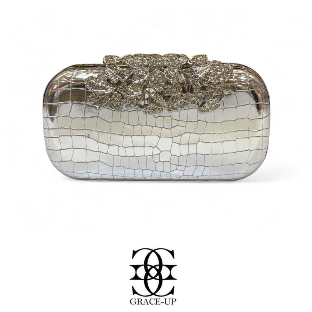 A perfect clutch for daily use! Featured silver chrome textured synthetic leather & heavy stones flap with metal case. Contains complimentary chain for hassle free wear!