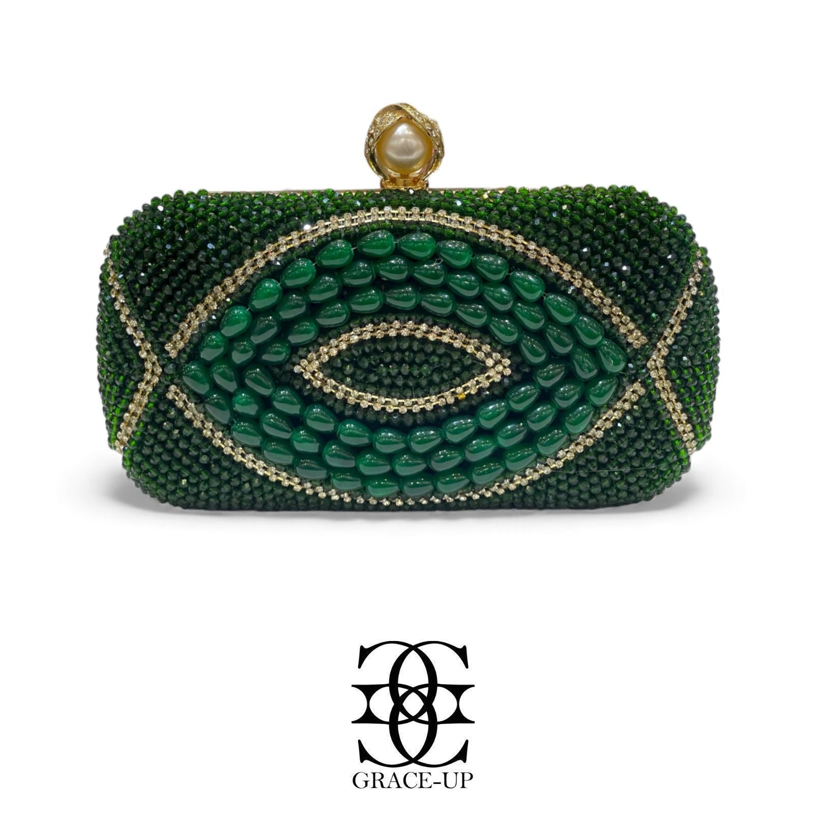 A perfect clutch for Brides! Featured green beads embroidery (singles side)& pearl metal nob. Contains complimentary bangle for hassle free wear.