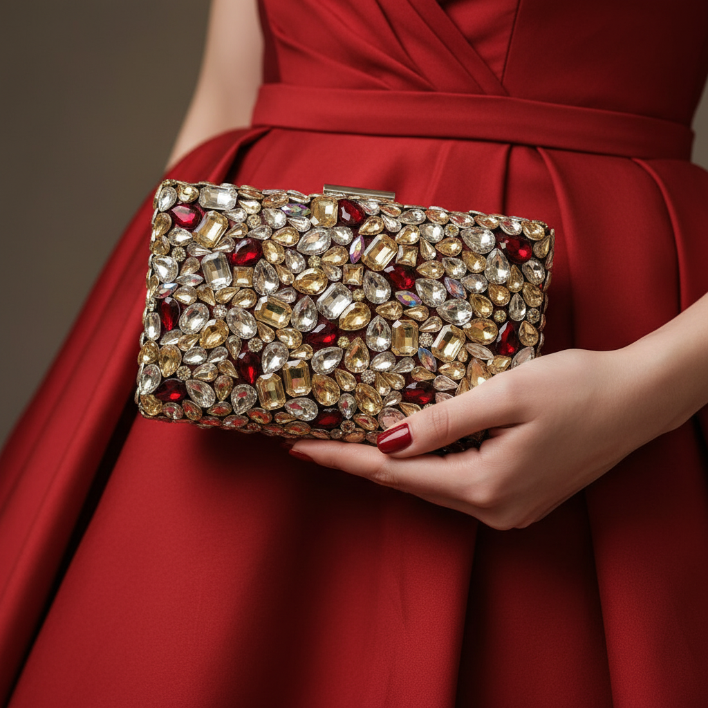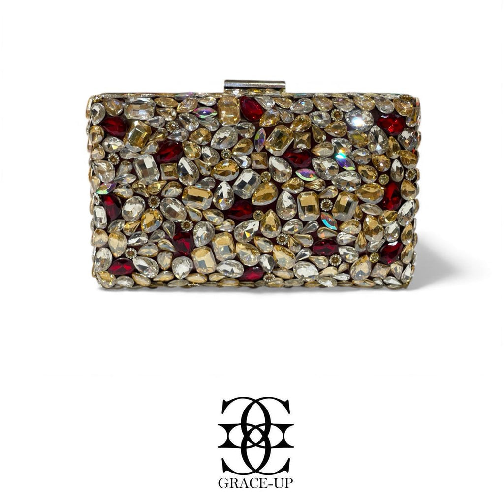 A perfect clutch for brides ! Featured maroon/silver with big stones single side & metal case. Contains complimentary bangle for hassle free wear!