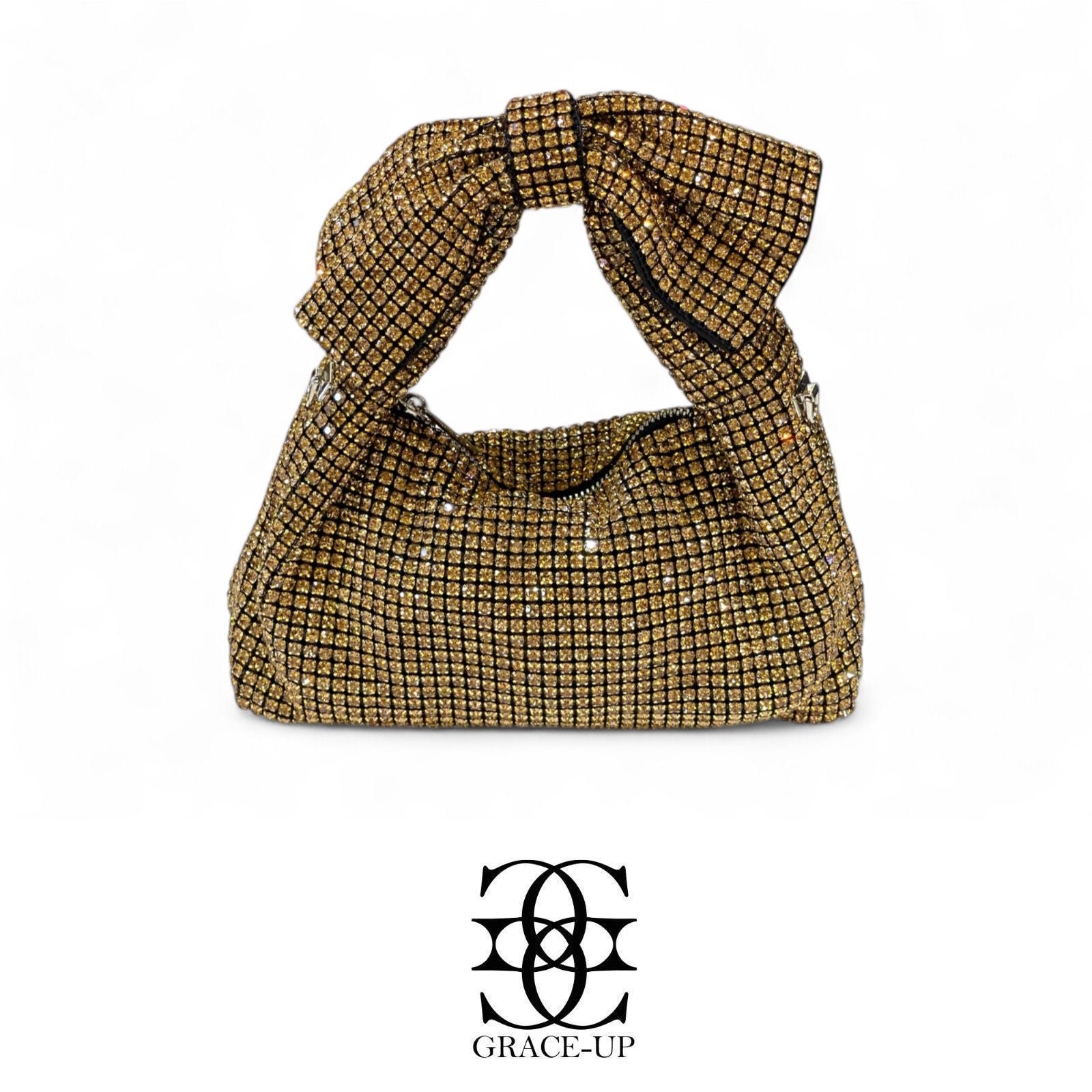 A perfect bag for bridal wear! Featured Full gold big stones double side & stylish hanging with bow on top.contains complementary chain for hassle free wear!